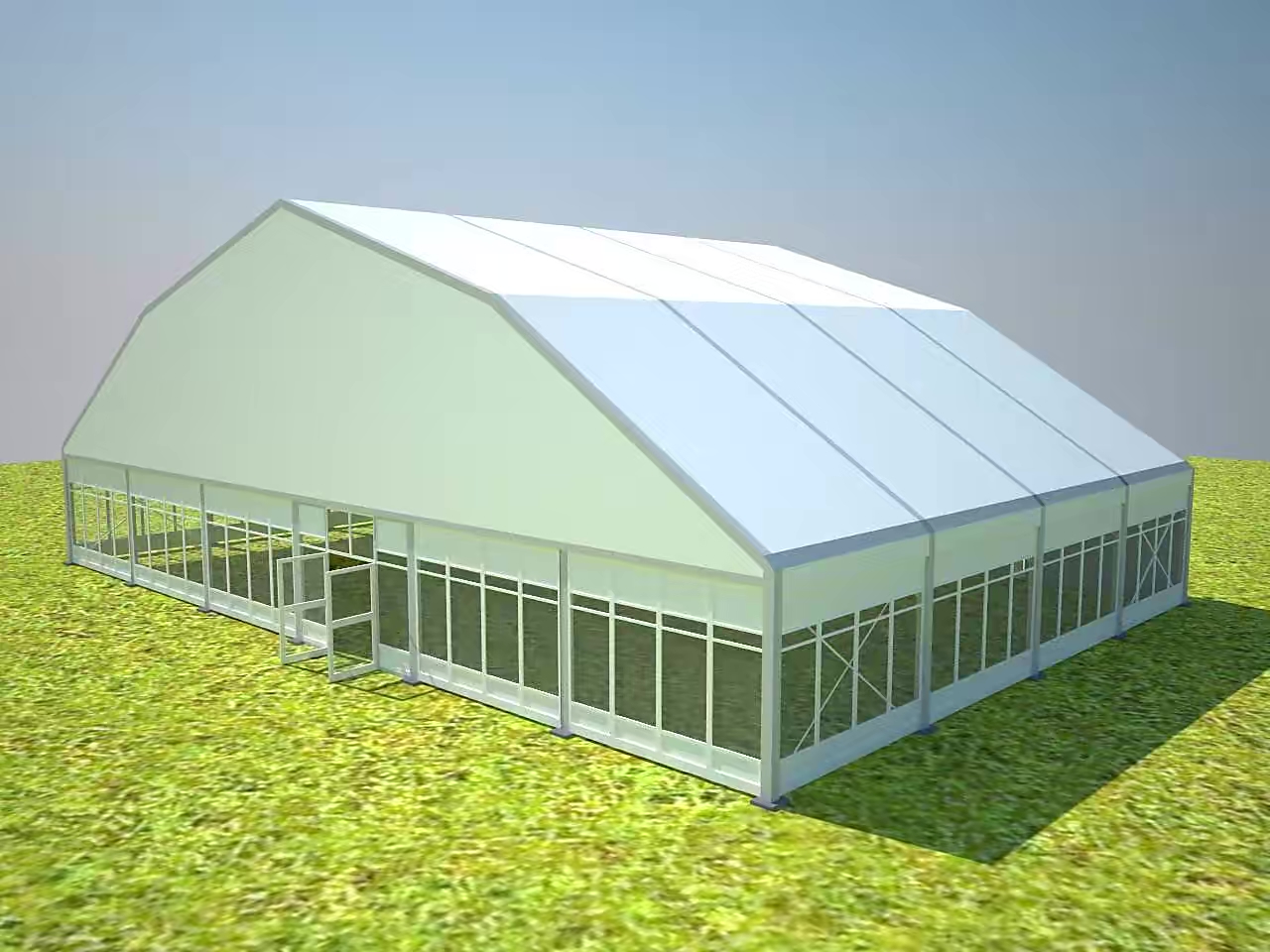 篷房有钢 铝和全铝。产品宽度由3米到米,节距3米或5米任意增加。内部没有立柱空间利用率 , 可根据场地情况的不同采用钢钎或承重地盘固定具有良好的抗风性。篷布顶部采用PVC涂层布具 有防紫外线 阻燃 自洁等特点,围布采用透光布。