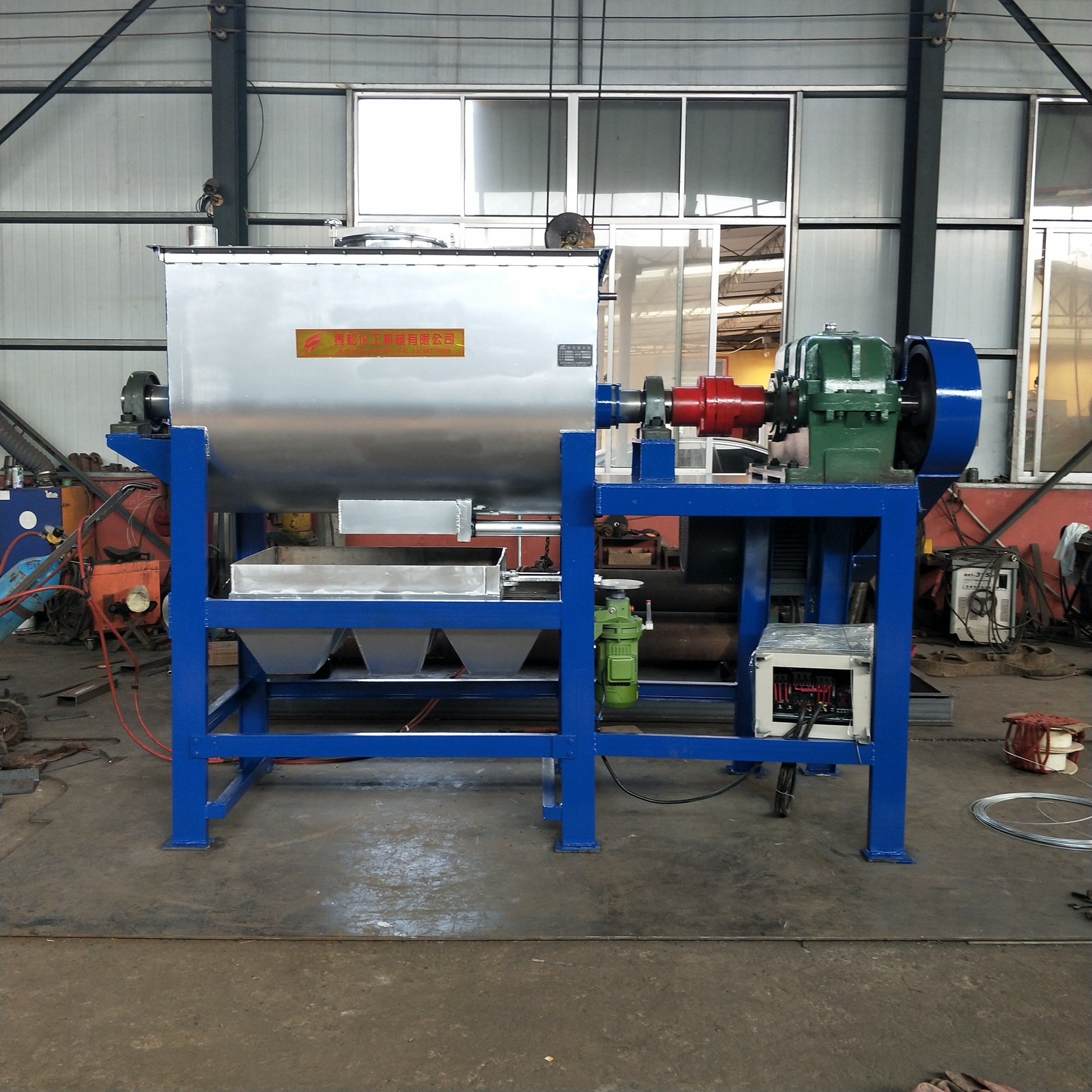 卧式螺带混合机由U形容器、螺带搅拌叶片和传动部件组成;U形的长体筒体结构,保证了被混合物料(粉体、半流体)在筒体内的小阻力运动。正反旋转螺条安装于同一水平轴上,形成一个低动力高效的混合环境,螺带状叶片一般做成双层或三层,外层螺旋将物料从两侧向中央汇集,内层螺旋将物料从中央向两侧输送,可使物料在流动中形成更多的涡流。加快了混合速度,提高混合均匀度;本机为双螺带卧式混合机,其功能是将各种成分的粉料,液体混合均匀,具有适用性广,混合均匀度好,物料残留少,维修保养方便等特点,是粉状物料混合加工的理想设备。