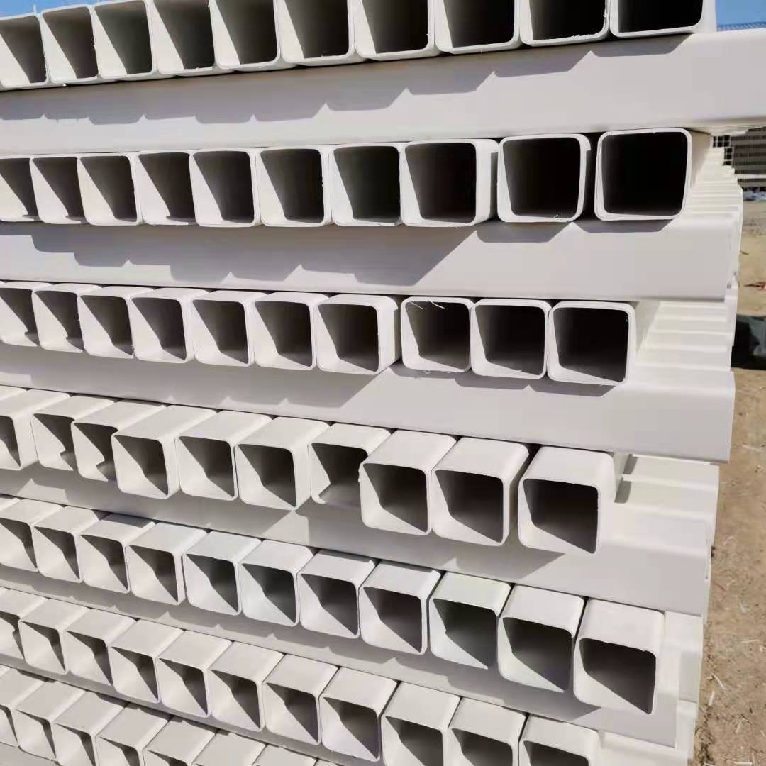 PVC方管:横截面为若干个正方形结构组成的多孔矩形(角部有一定弧度)塑料管。产品具有多个孔位,可以直接穿缆,