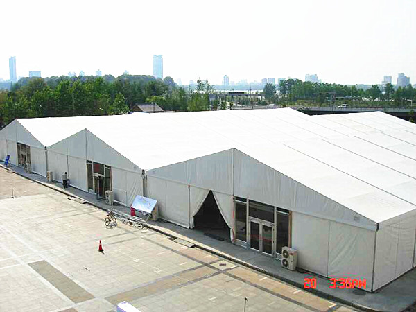 篷房有钢 铝和全铝。产品宽度由3米到米,节距3米或5米任意增加。内部没有立柱空间利用率 , 可根据场地情况的不同采用钢钎或承重地盘固定具有良好的抗风性。篷布顶部采用PVC涂层布具 有防紫外线 阻燃 自洁等特点,围布采用透光布。