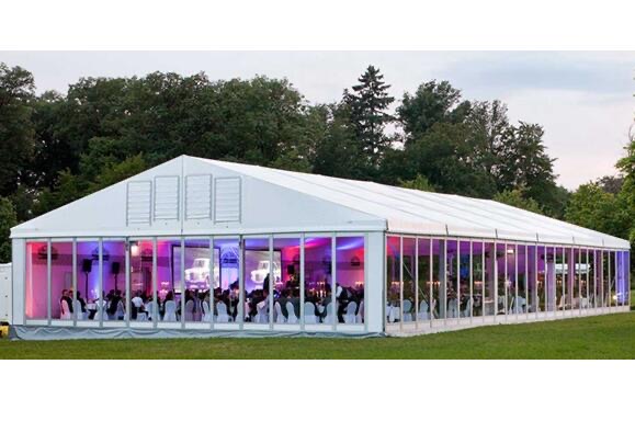 篷房有钢铝和全铝。产品宽度由3米到50米,节距3米或5米任意增加。内部没有立柱空间利用率100% , 可根据场地情况的不同采用钢钎或承重地盘固定具有良好的抗风性。篷布顶部采用PVC涂层布具 有防紫外线 阻燃 自洁等特点,围布采用透光布。篷房跨度有从6米,8米,9米,10米,15米,18米到50米等。