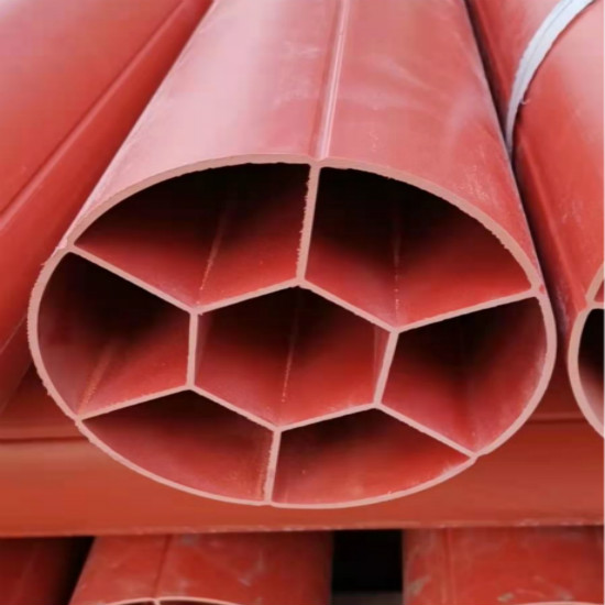 电力七孔管是硬直实壁管,内、外壁光滑平整,颜色呈桔红色,明亮、醒目。