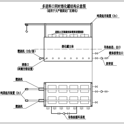 该设备是以高温导热油或者高温烟气为热源,通过管束、盘管对吨袋(包)或大块固体沥青进行分割、熔化、升温的专用设备,主要用于吨袋(包)固体沥青进行分割、熔化、升温的专用设备,主要用于吨袋(包)固体沥青的熔化、升温及保温储存。