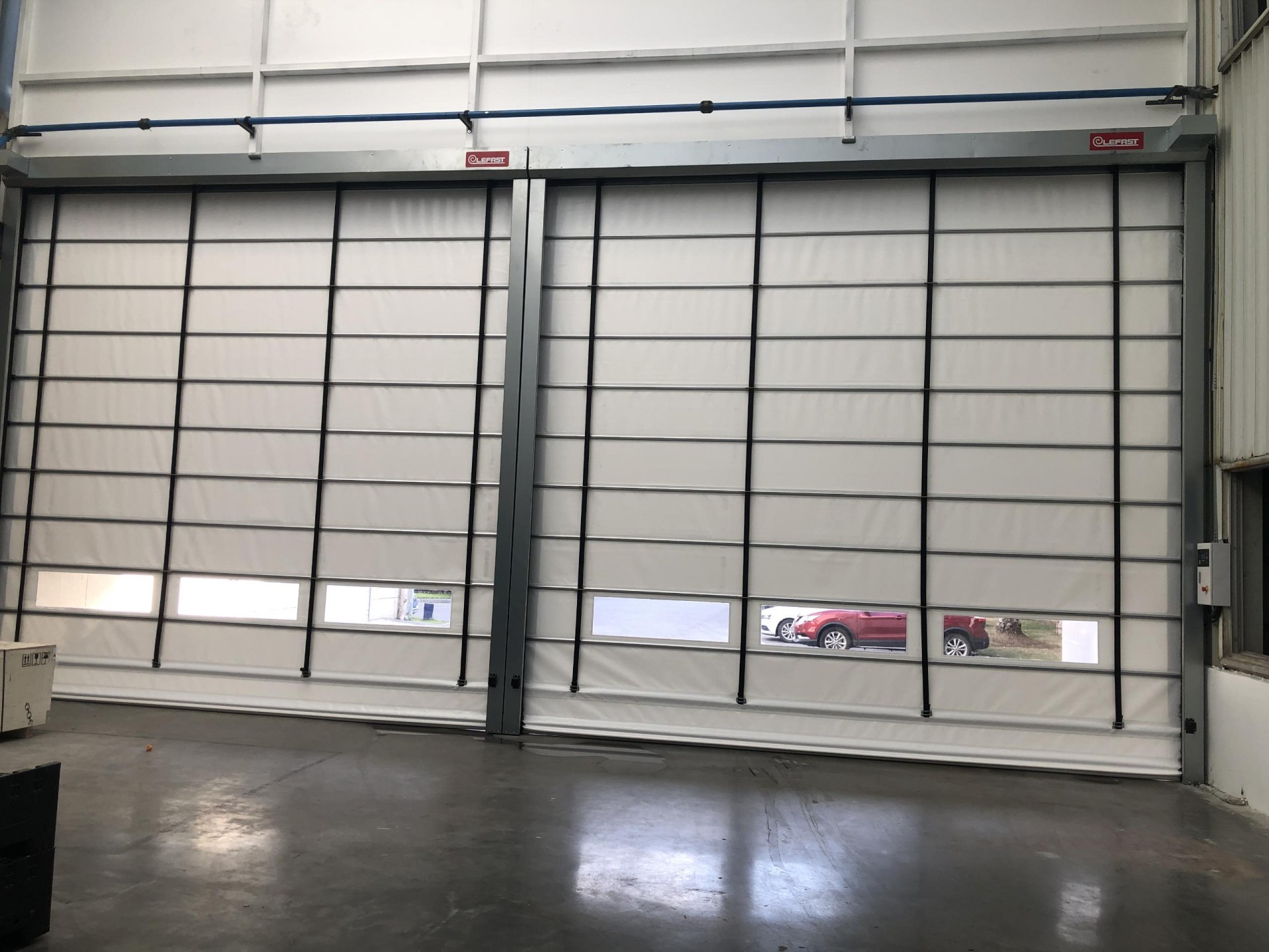 快速堆积门门帘采用0.8mm 厚的内夹网状高强纤维的PVC涂层布,门帘可以根据客户要求添加透明视窗,能够满足客户多方面的要求。